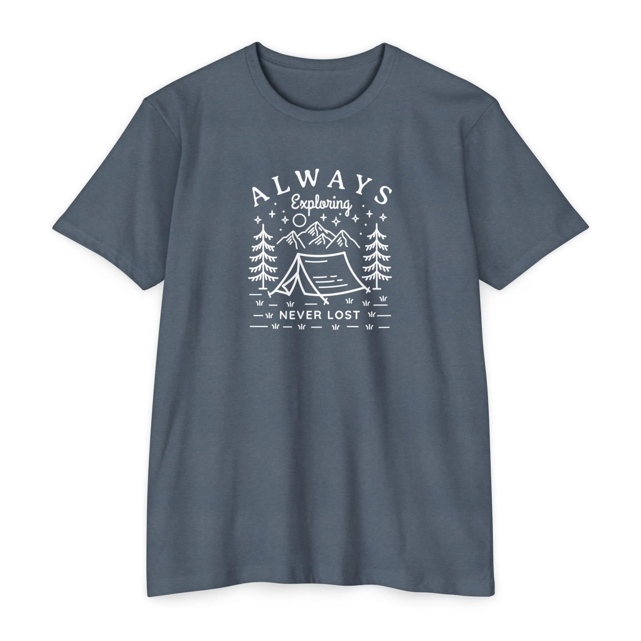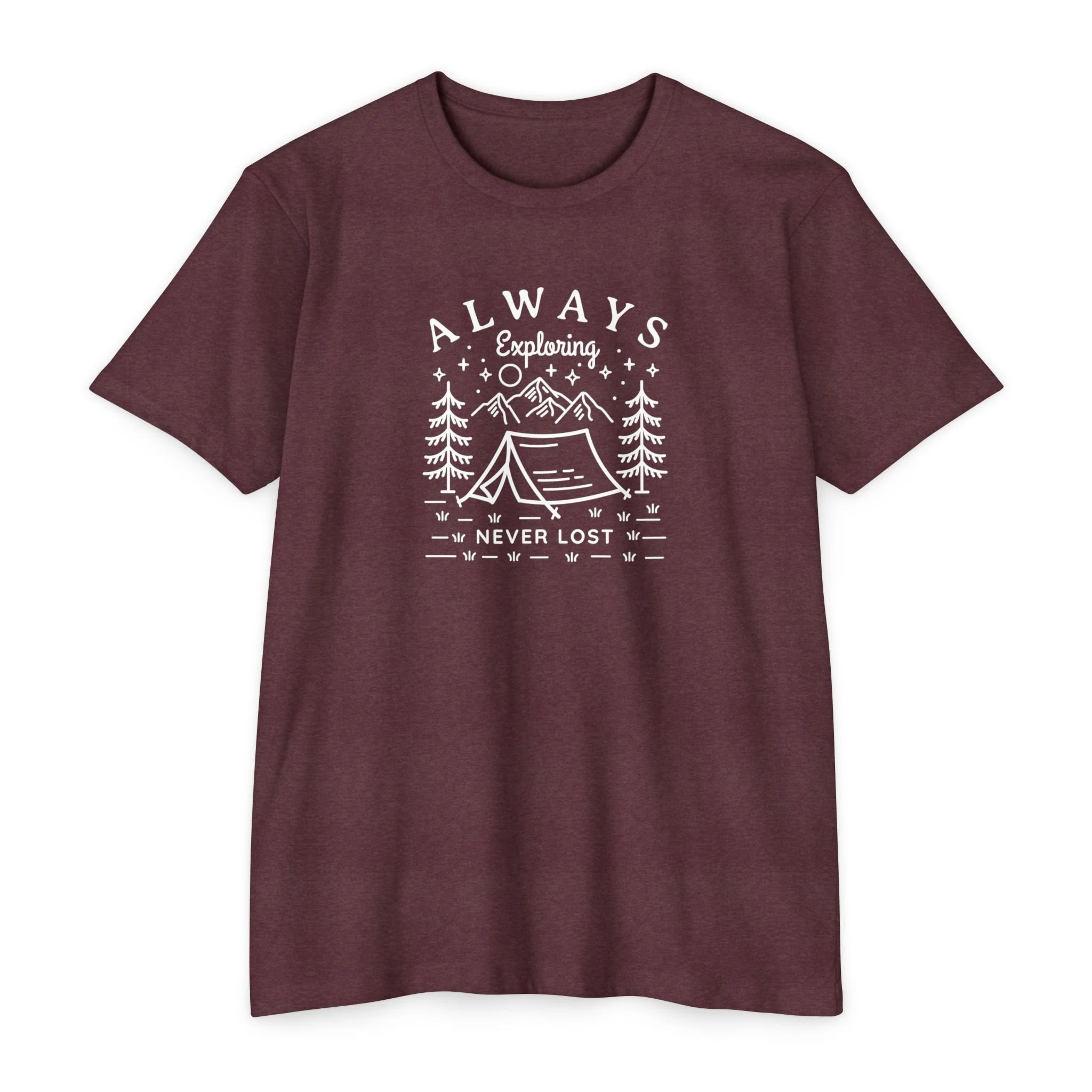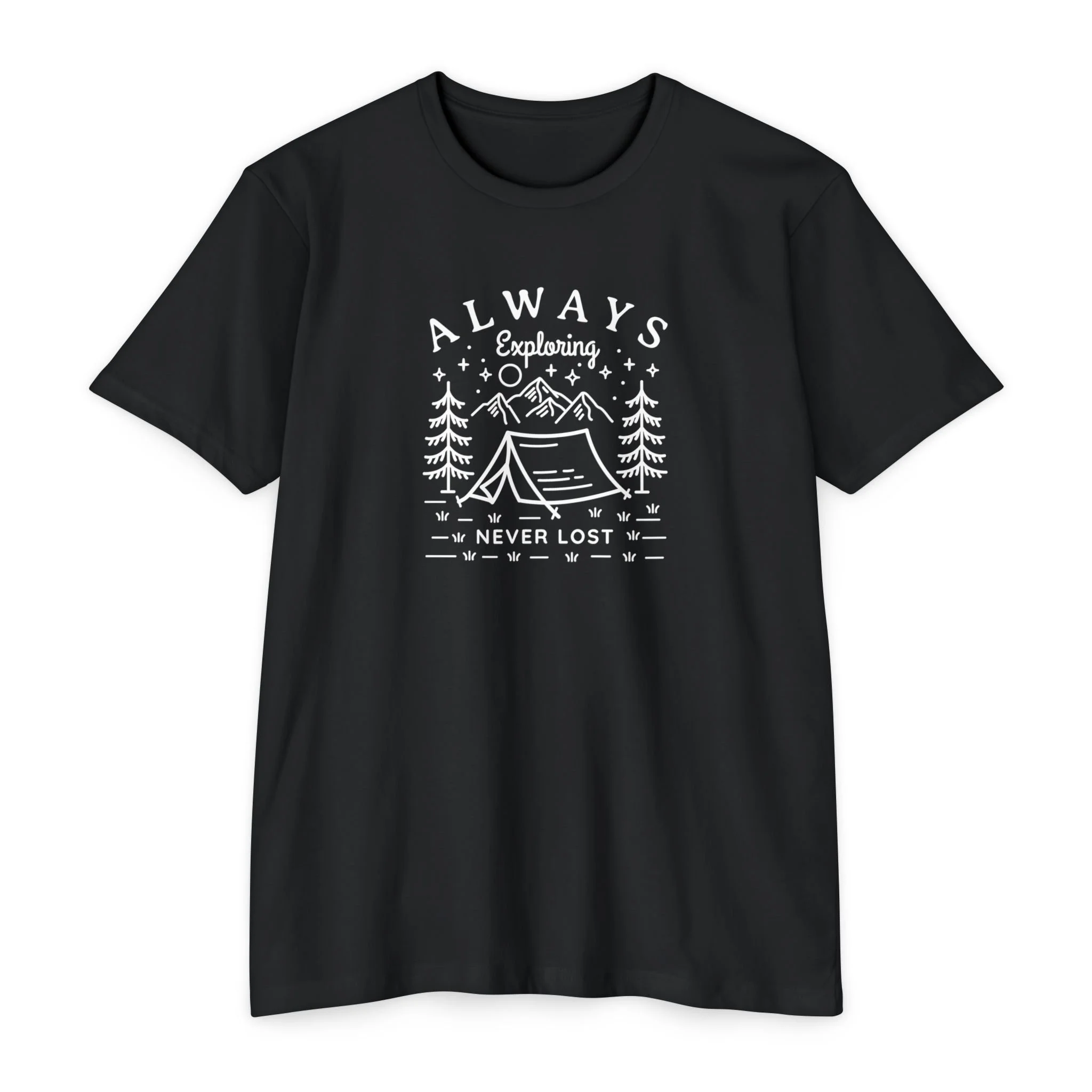 Wear the quiet pull of the woods. This soft classic-fit tee carries a hand-drawn campsite scene and the phrase “Always Exploring — Never Lost,” evoking early-morning dawns, worn maps, and coffee poured over a tiny stove. It sits comfortably through long drives to trailheads and slow evenings by a crackling fire. The lightweight fabric breathes on warm days and layers cleanly under a flannel when temperatures dip. For people who measure life in miles and small discoveries, this shirt feels like the easy companion you reach for before stepping out the door.