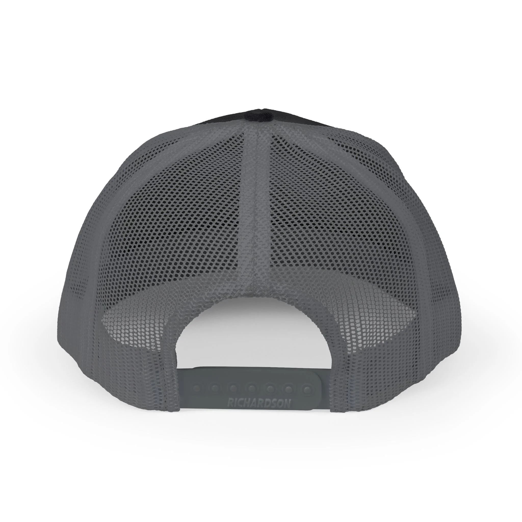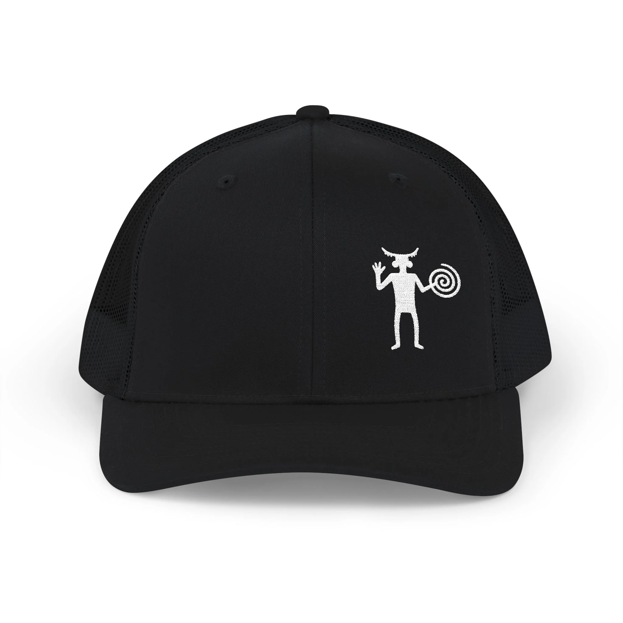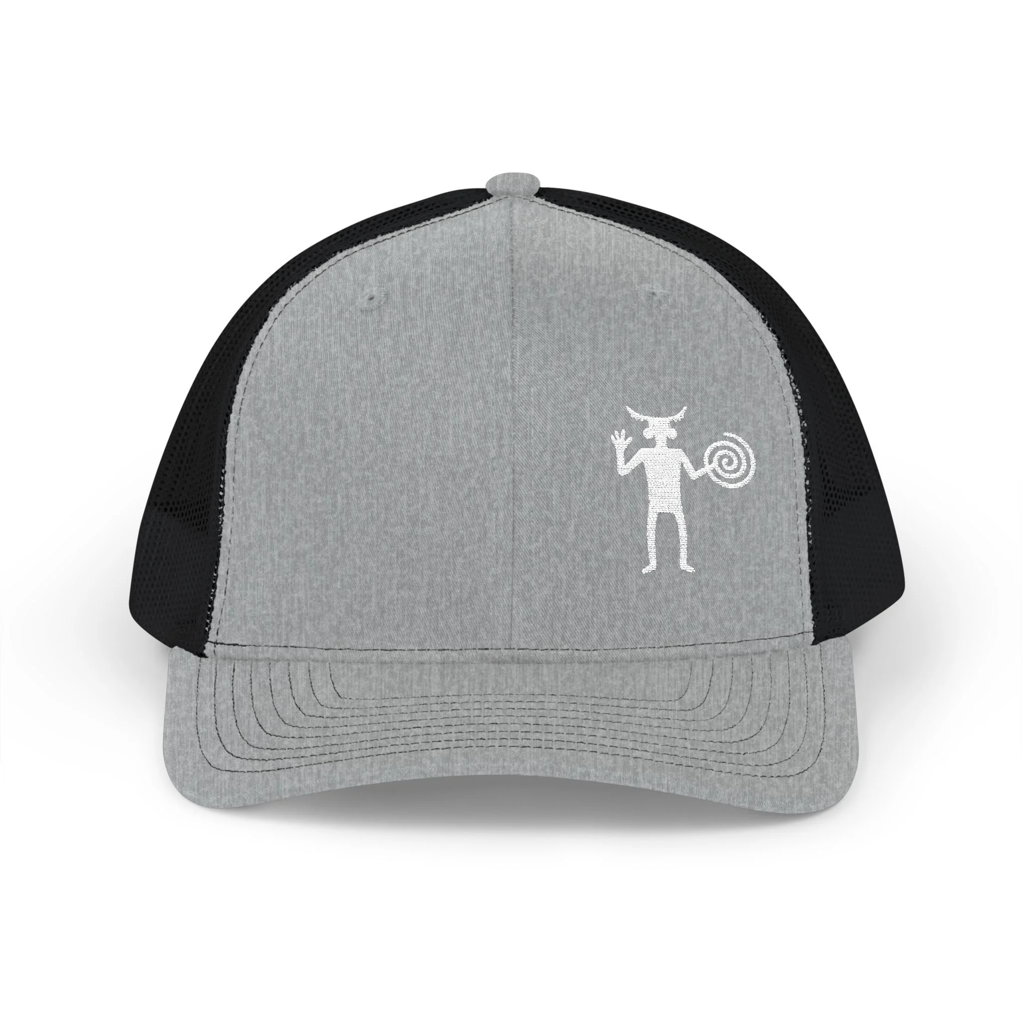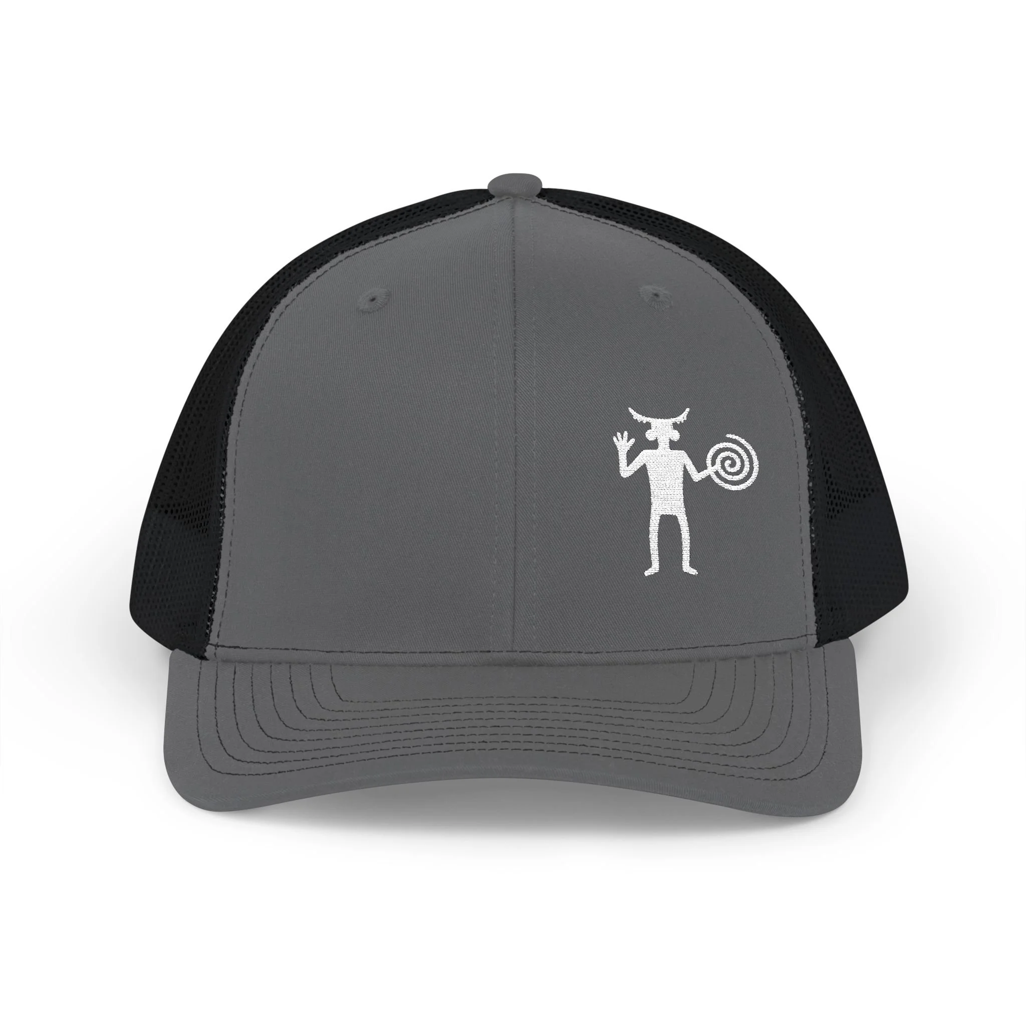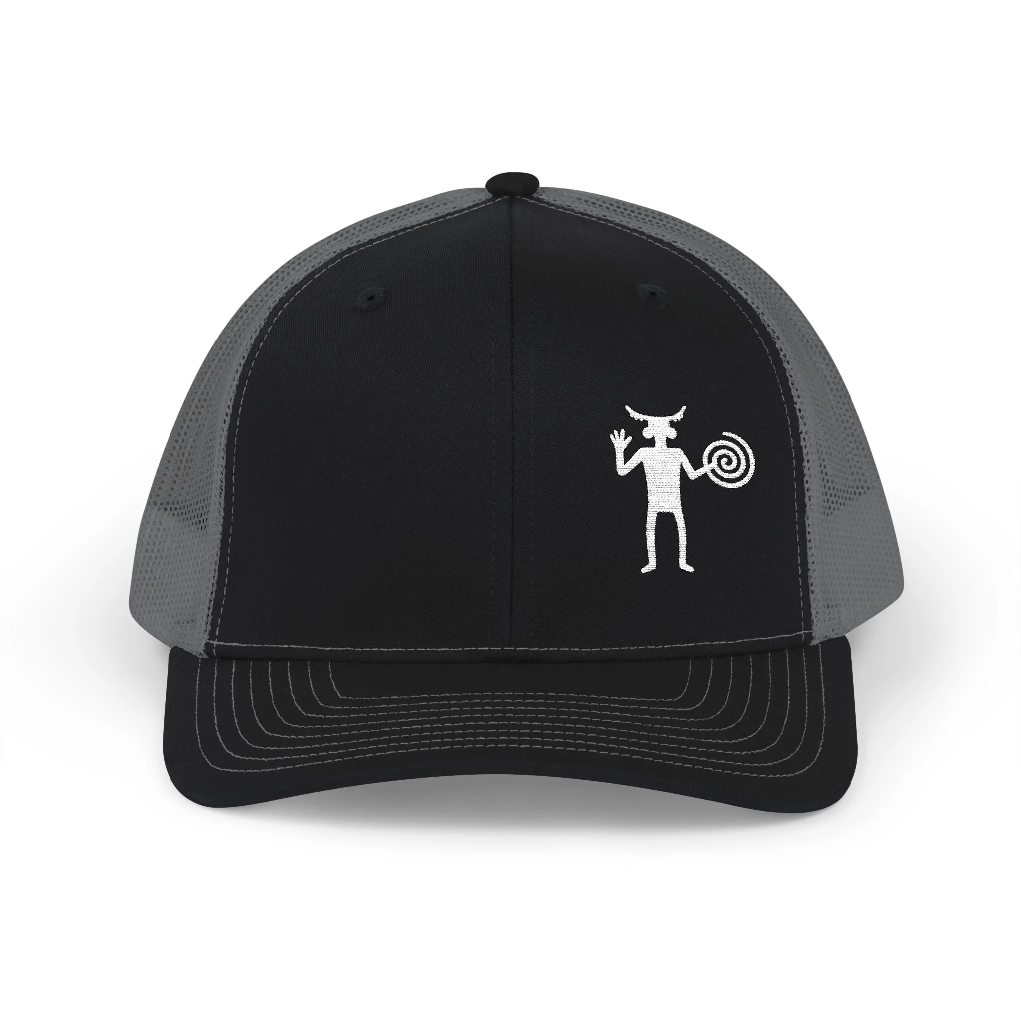 A classic trucker cap featuring an embroidered figure inspired by a real Fremont-era petroglyph from the Newspaper Rock area near Moab, Utah. The design captures the iconic broad-bodied figure with its circular “shield,” one of the most recognizable symbols found on the sandstone walls of the desert Southwest.
